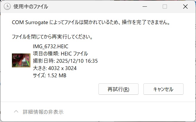 最近画像ファイルを扱うようになり、いろいろ整理すると「COM Surrogate によってファイルは開かれているため、操作を完了できません。」と言われて削除できないことがあります。