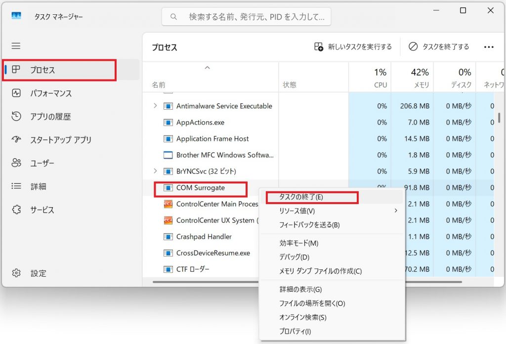 (2)プロセス一覧を表示させ、名前のから「COM Surrogate」を探しだし、右クリックから「タスクの終了」を選択します。